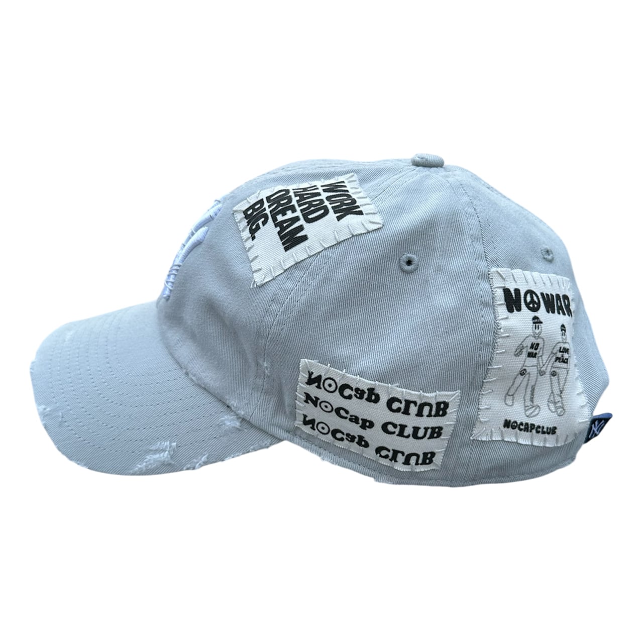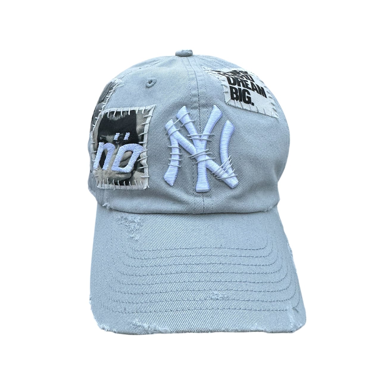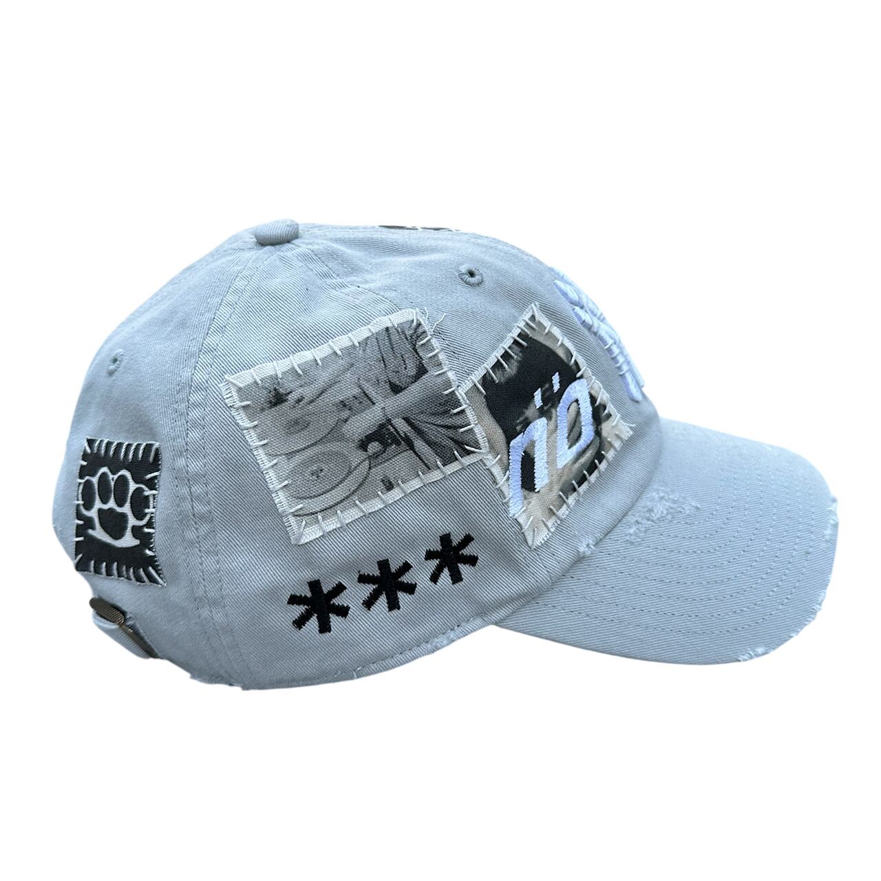 パッチを手縫いで縫った後に機械刺繍、ダメージ加工を施した1点物のアイテム。