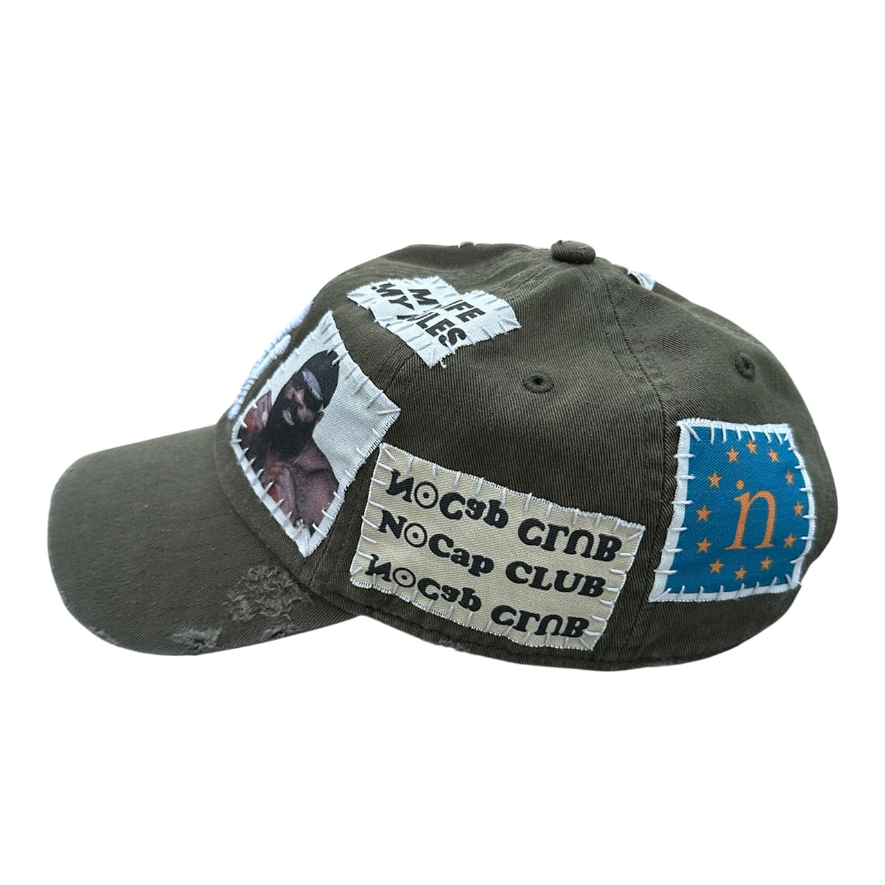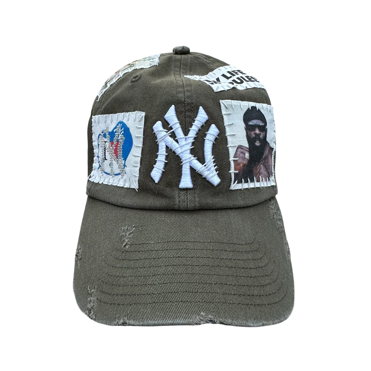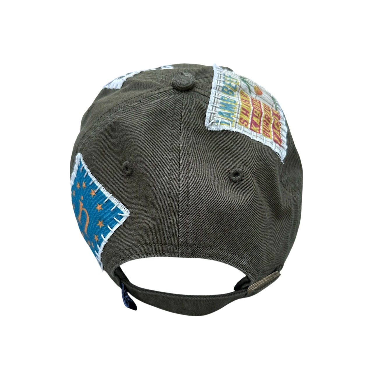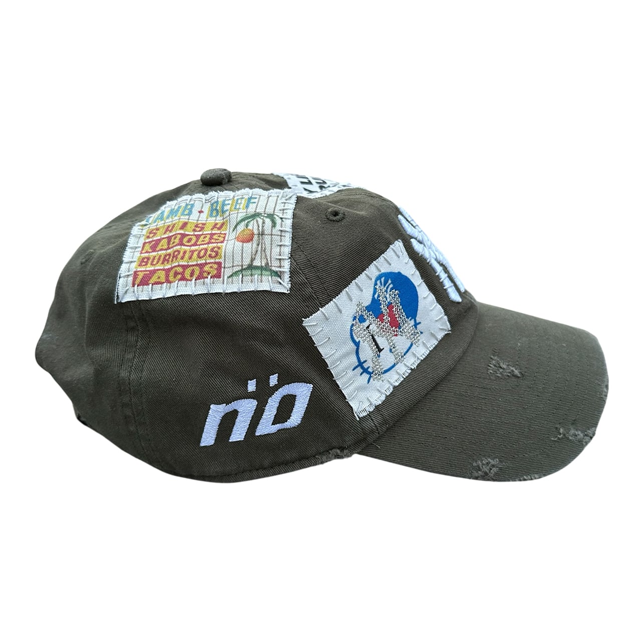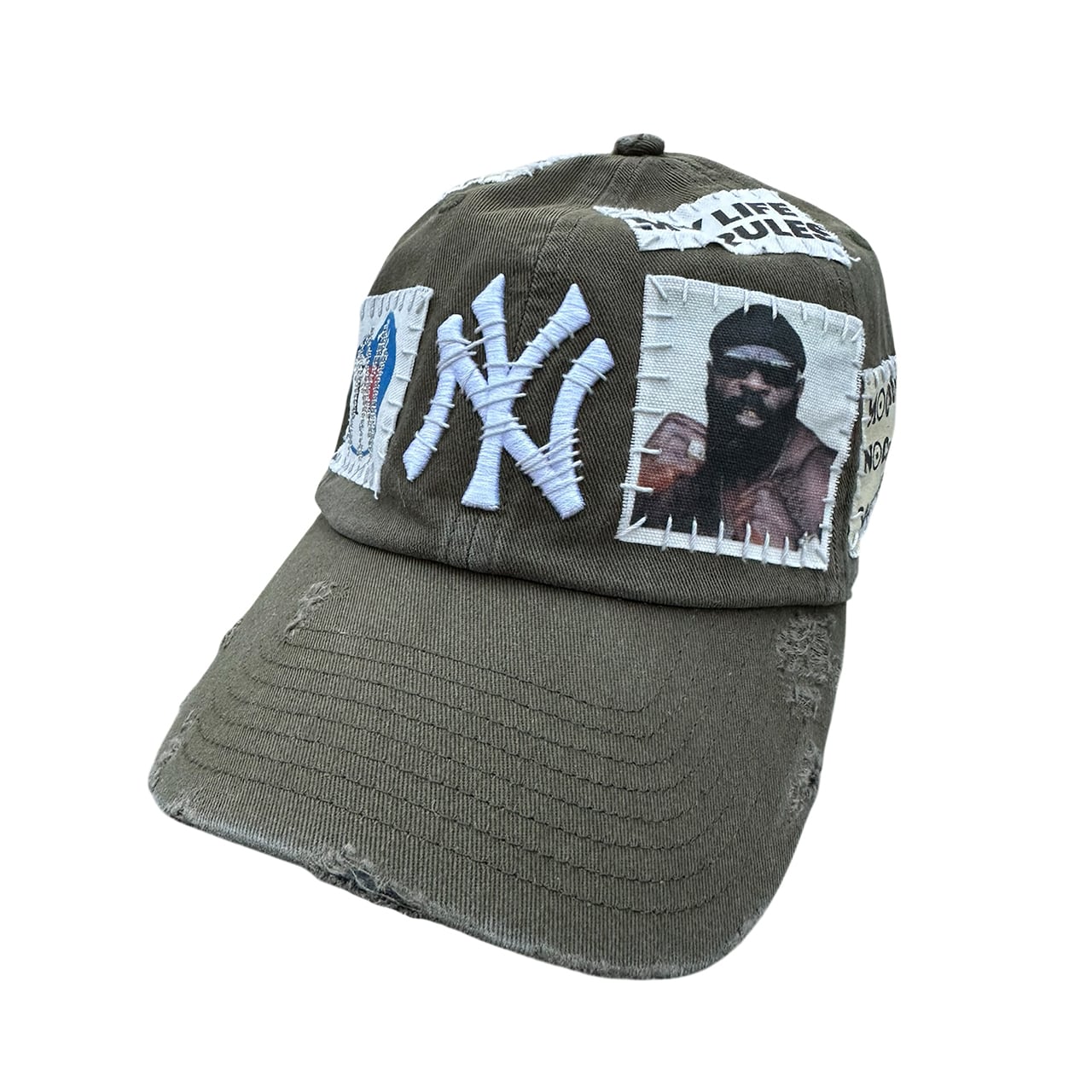 パッチを手縫いで縫った後に機械刺繍、ダメージ加工を施した1点物のアイテム。
